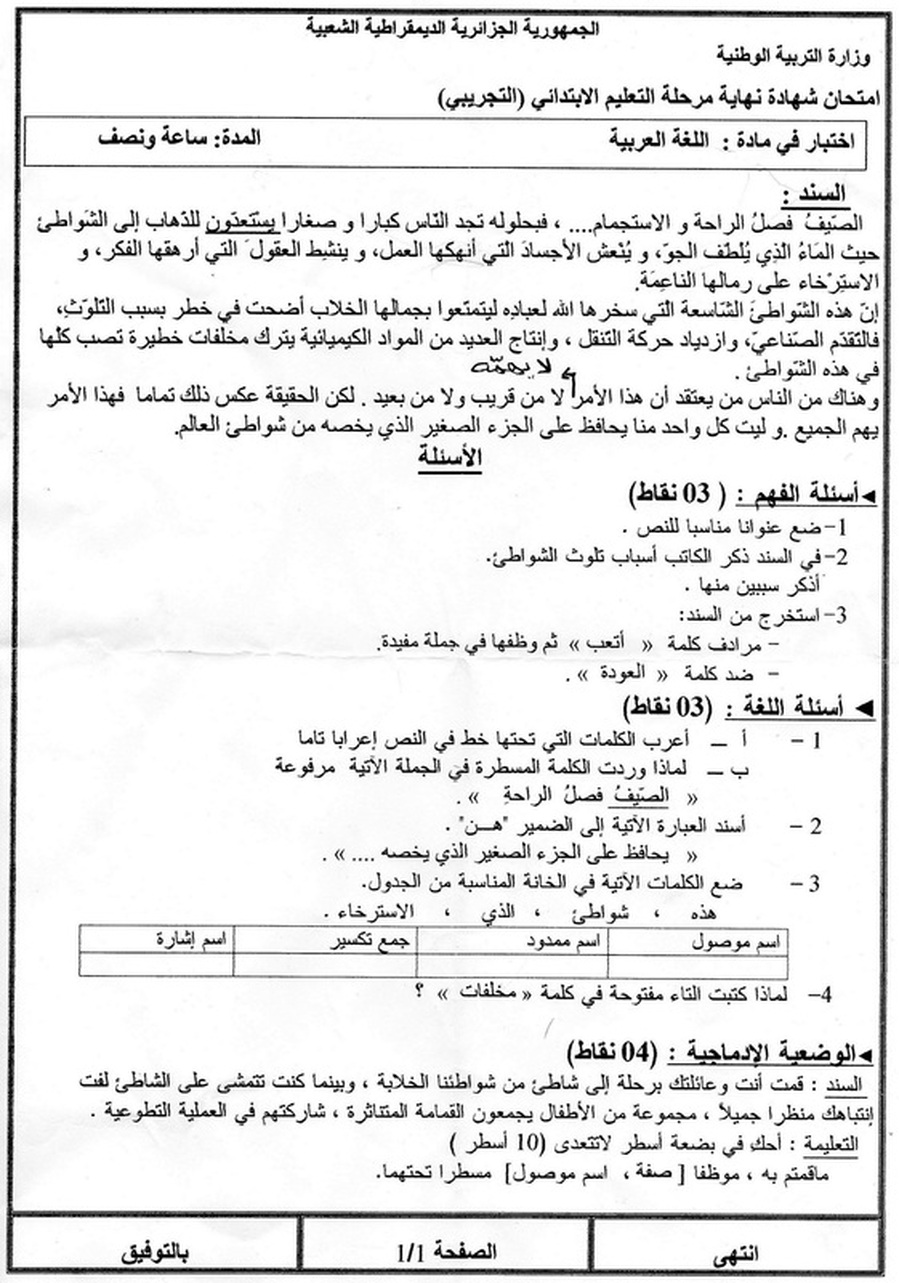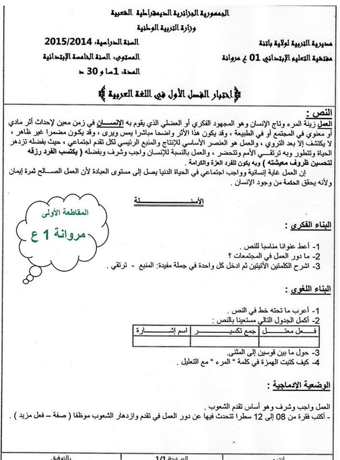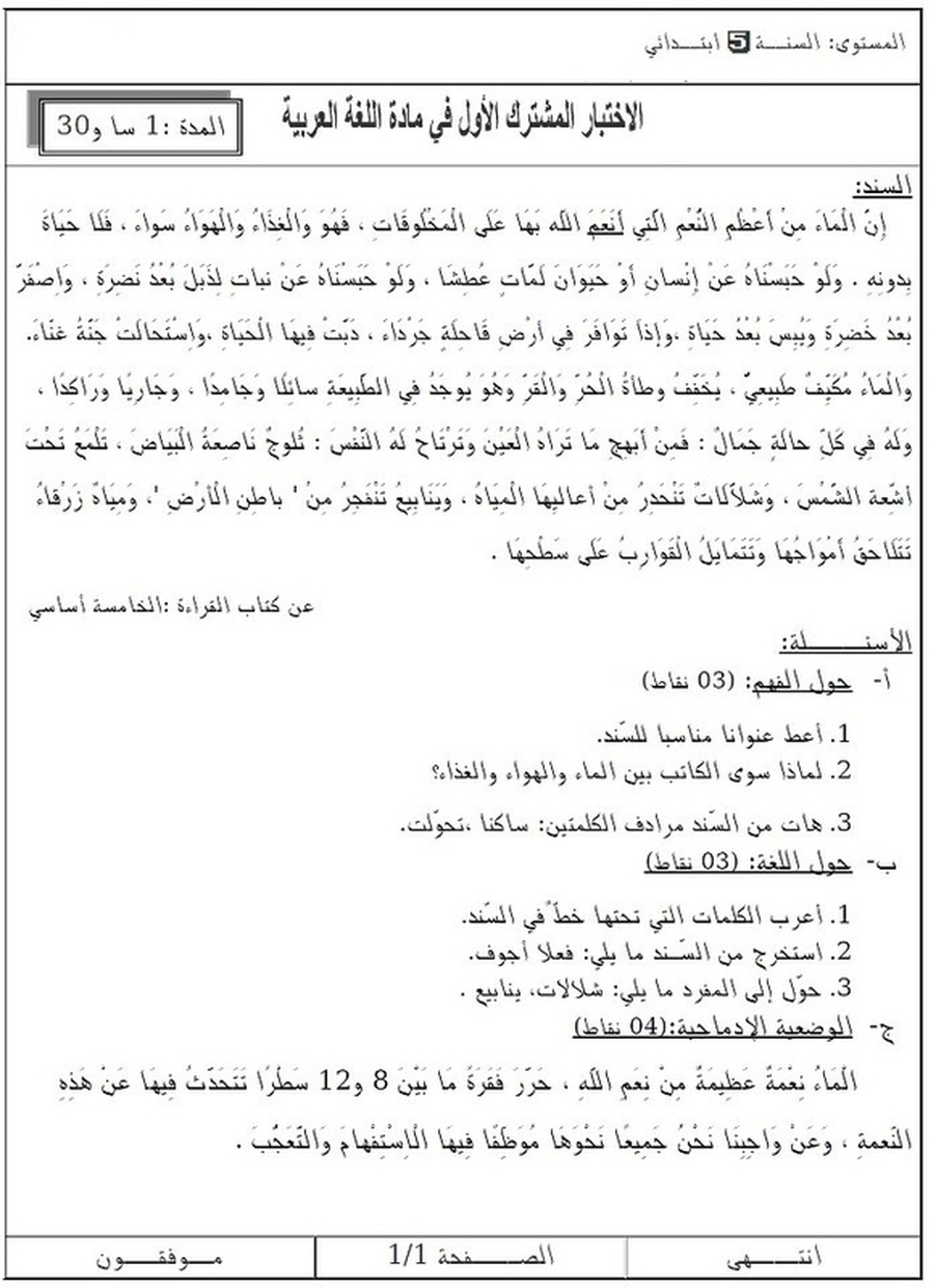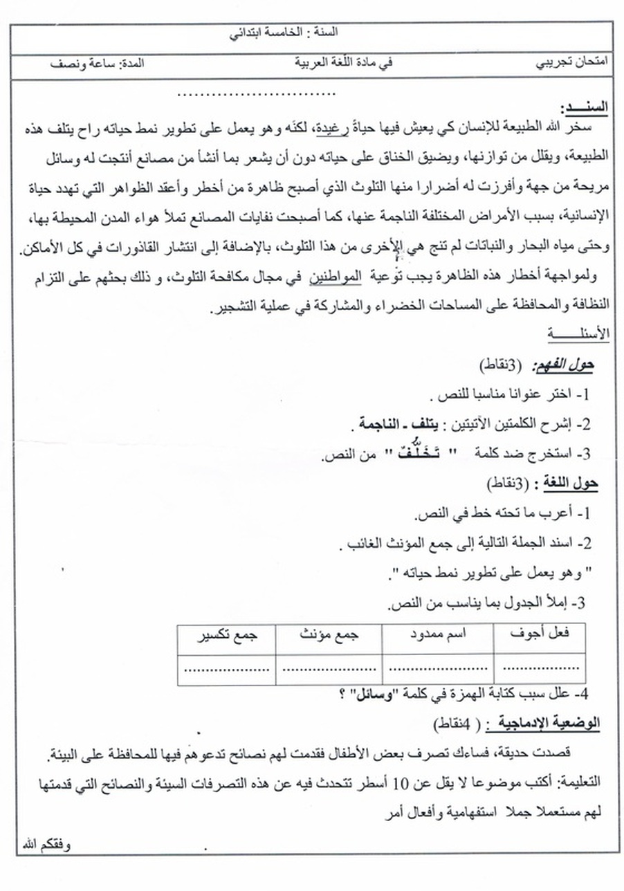 نماذج اختبارات اللغة العربية 5 ابتدائي